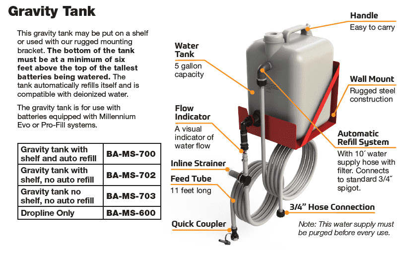 This version of the gravity tank may be placed on a shelf or used with a separate mounting bracket. Note that the bottom of the tank must be at a minimum of six feet above the top of the tallest batteries while watering. The 6 foot distance will ensure consistent water flow between 2-5 GPM. Recommended to be refilled with deionized water the gravity tank is for use with batteries equipped with Millennium Evo or Pro-Fill systems.
